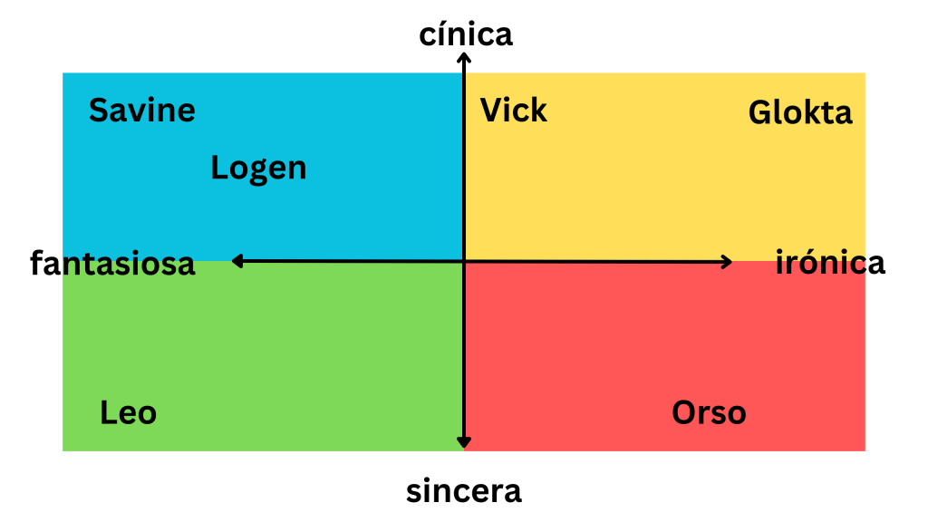 Así, uno puede tener una narración irónica-cínica o fantasiosa-sincera, pero no fantasiosa-irónica o cínica-sincera. Pues no hay nada que repele más el cinismo que la sinceridad y la fantasiosidad no resiste la ironía (o cualquier tipo de humor, como veremos más adelante). El eje X indica la percepción del mundo y de la propia persona y su espectro es el de la realidad. El eje Y marca la actitud general hacia el mundo y su espectro es el de la vulnerabilidad.